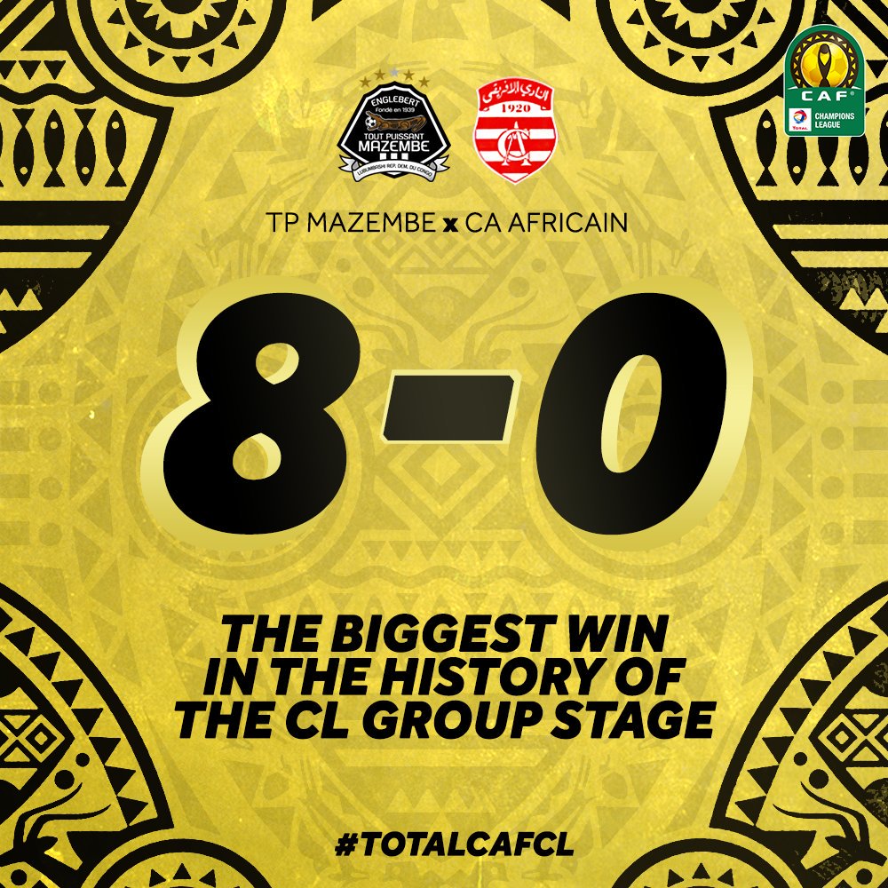اكتسح نادي مازيمبي الكونغولي نظيره الأفريقي التونسي بثمانية أهداف دون رد، في المباراة التي جمعتهما اليوم بملعب مازيمبي، ضمن منافسات الجولة الثالثة لدور المجموعات.